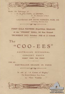 (1916-1919) Established in December 1916 to provide Christmas and New Year’s entertainment for A.I.F. troops, the Coo-ees concert party continued to perform along and behind the battle lines in France and elsewhere through until 1919. The original troupe comprised six performers, but by early 1918 had been expanded to over 30, including an orchestra. Performers who found success on the variety stage after the war included Jock Thompson and George Harvey.