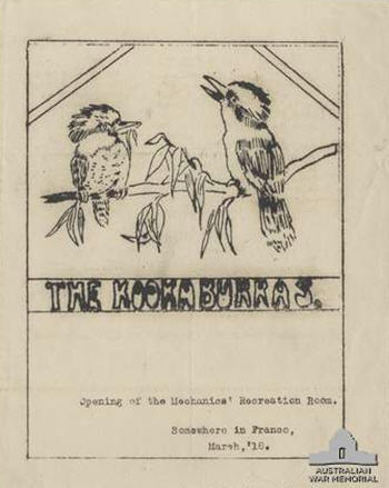 (1916-1919) One of the first Australian concert parties to begin operating along the battle lines of Europe during World War I, The Kookaburras (aka The Kooks) were established in late 1916 and continued through until 1919. Among the artists associated with the troupe were George Long (female impersonator), George Jennings (vocalist) and Johnny Marks (later a member of the Famous Diggers).